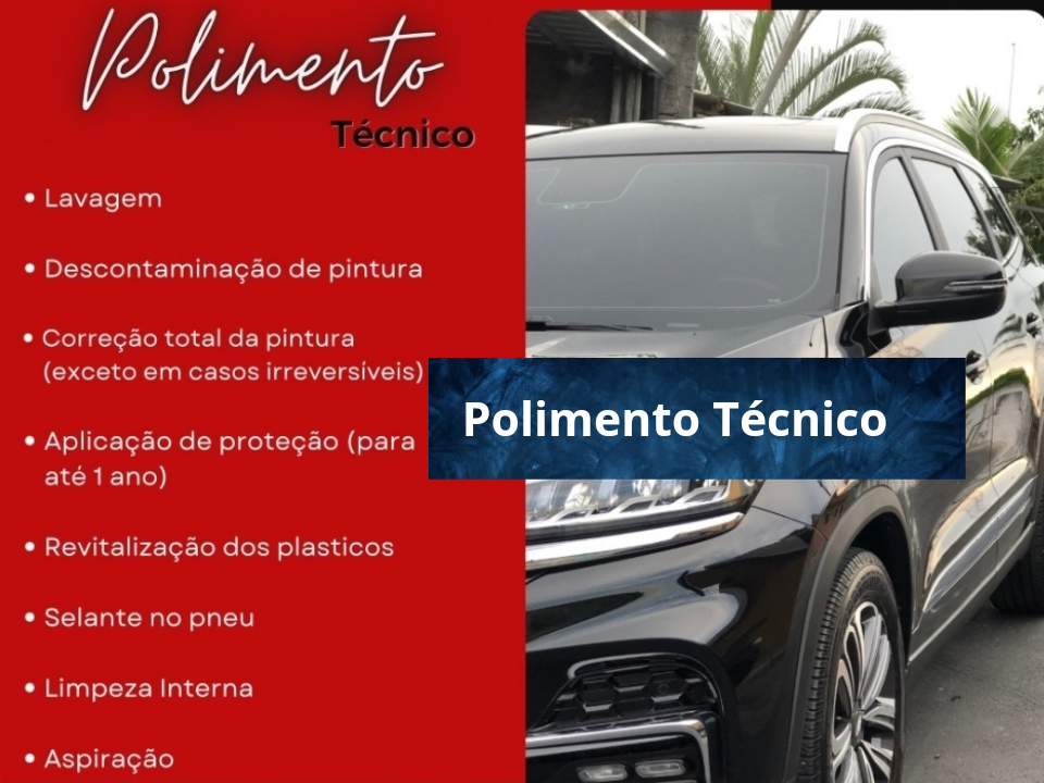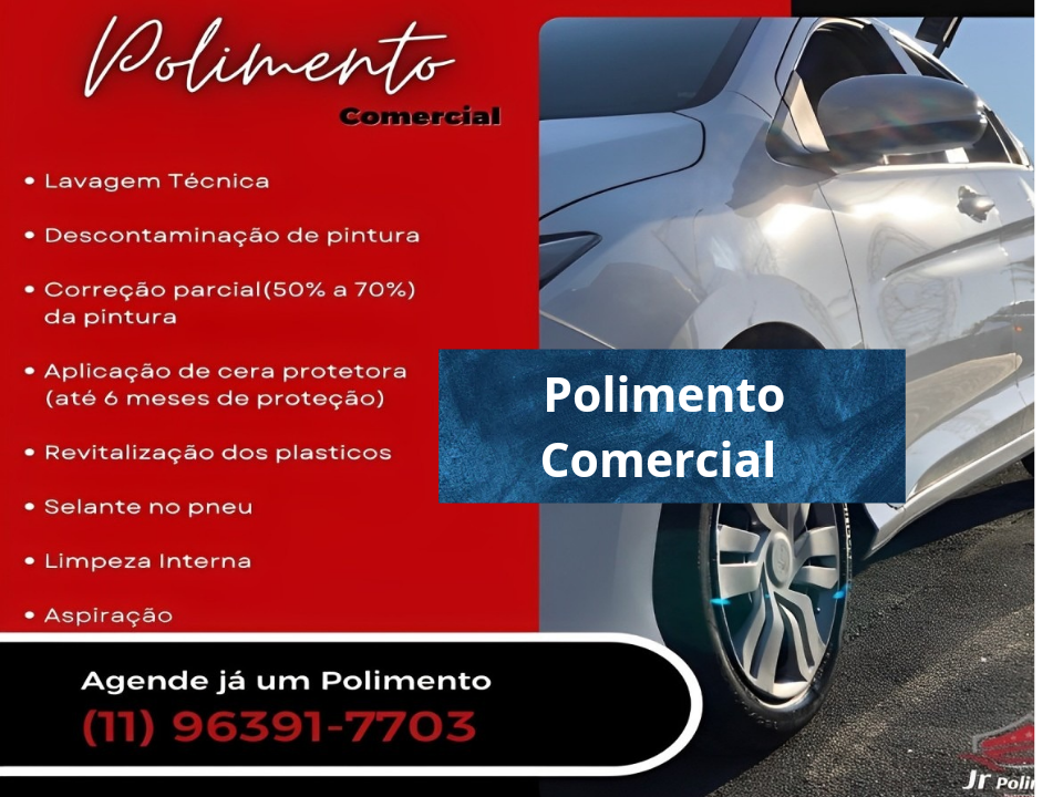 A Jr-polimentos Estética automotiva, transforma e recupera seu automovel, com: -Polimento técnico, lavagem, descontaminação da pintura(exceto em casos irreversíveis) aplicação de proteção ( com duração de até 1 ano),revitalização dos plásticos,selante nos pneus,limpeza interna e aspiração. -Vitrificação; proteção da pintura, aumento do brilho e duração do verniz original. -Polimento de carro: caracterizado , polimento comercial. lavagem técnica, descontaminação de pintura, correção parcial entre 50%-70% da pintura, aplicação de cera protetora (com até 6 meses de proteção), revitalização dos dos farois. selante nos pneus, limpeza interna e aspiração. -Higienização de ar condicionado completa + troca do filtro.